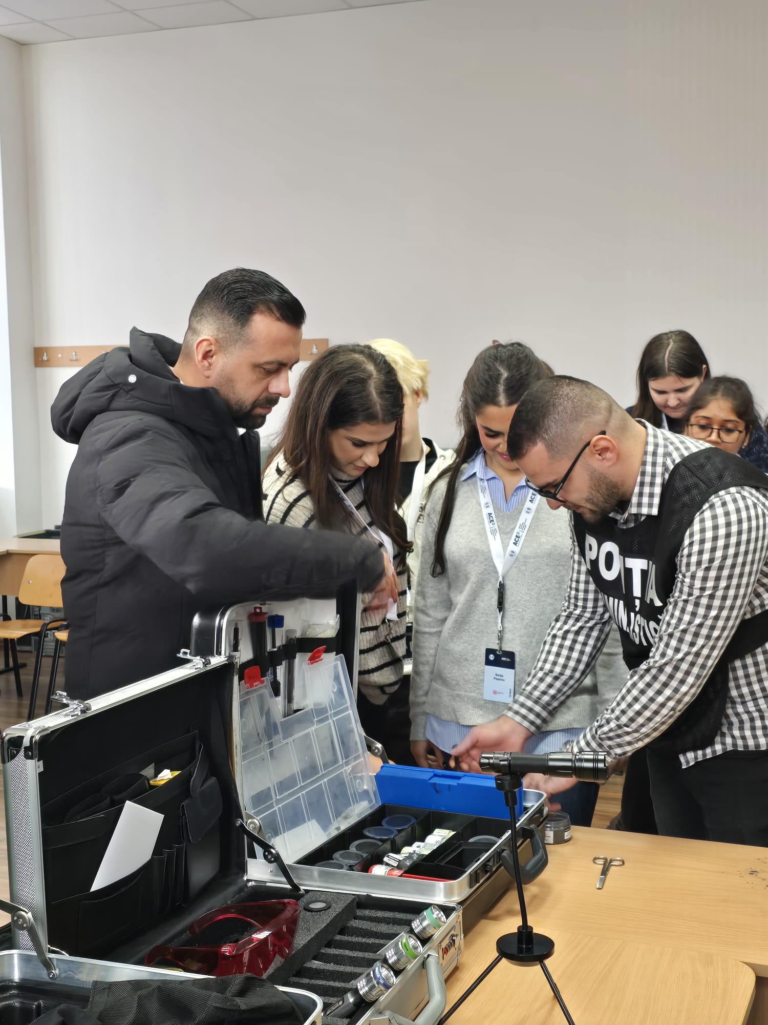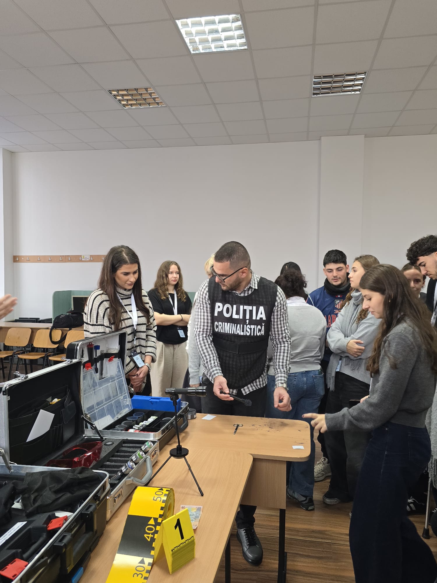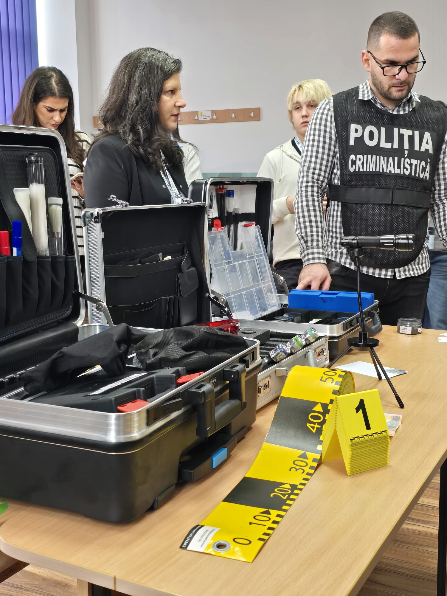 Guided by stakeholder Miruna Prejbeanu, police officer, participants engaged in real-life case simulations inside a mobile criminalistics laboratory. These exercises demonstrated: