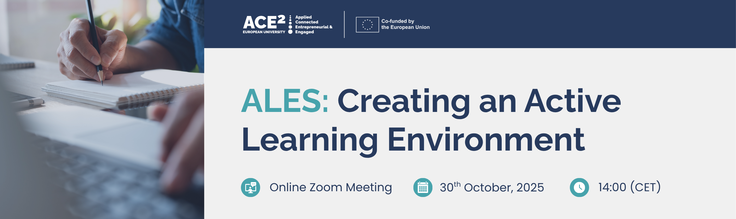 This 2-hour online training is part of the Active Learning e-Pedagogy Schools (ALES), an initiative within the ACE2-EU Pedagogy Unit. The Pedagogy Unit contributes to the ACE2-EU educational mission by developing training programmes that strengthen a shared pedagogical culture across the Alliance, focusing on active learning methodologies that include experiential, challenge-based and work-based learning approaches.