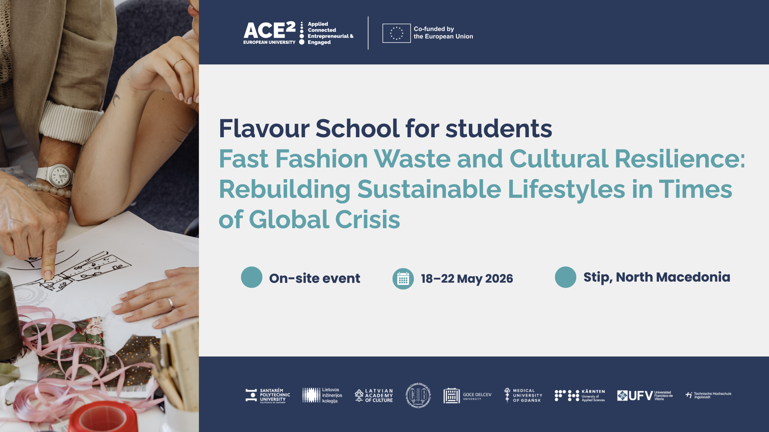 This Flavour School is a four-day immersive, challenge-based learning experience designed to foster interdisciplinary collaboration among students from the ACE2EU alliance. The course combines online preparation with intensive on-site activities and hands-on workshops, enabling participants to apply theoretical knowledge to real-world sustainability challenges in the textile and fashion sector. It will be open to students from all ACE2 -EU alliance members.